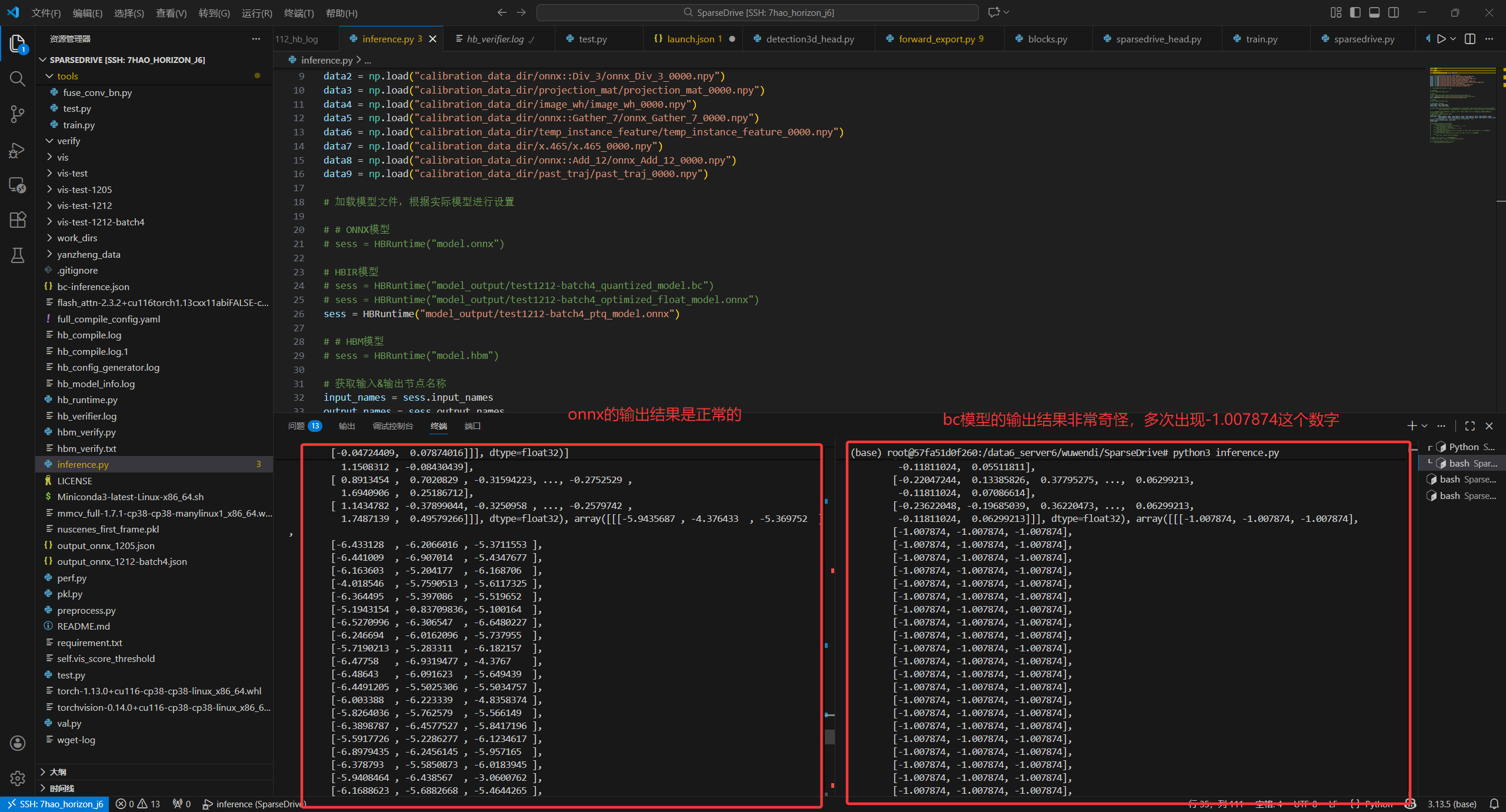 但是使用HBruntime工具对onnx和bc模型进行推理时,发现二者的推理结果相差极大(使用的同一份npy输入)。Onnx模型的推理结果是正确的,但bc模型的推理结果完全不同且非常怪异,推理结果中大量出现-1.007874这个数字