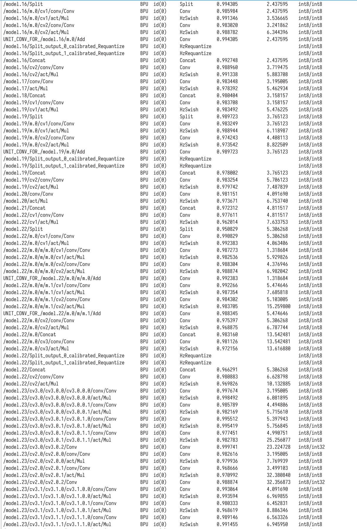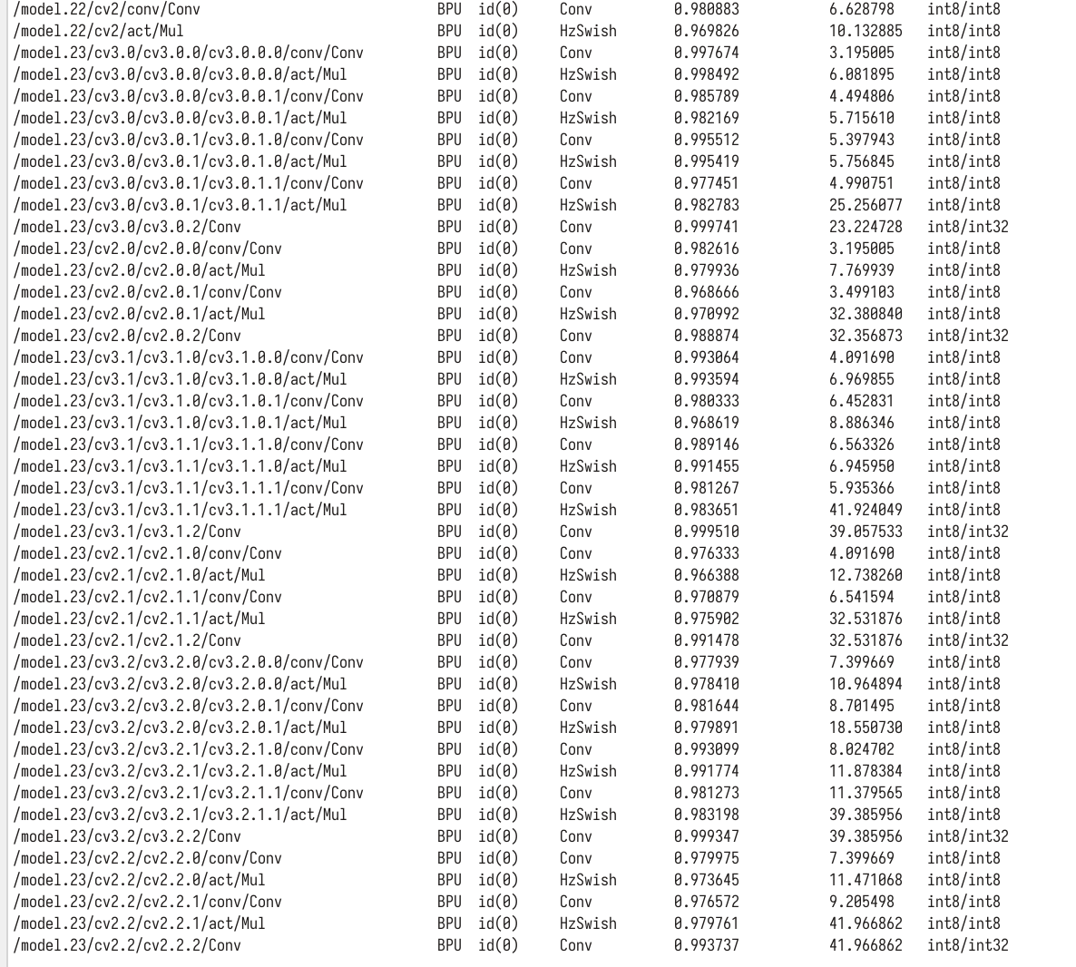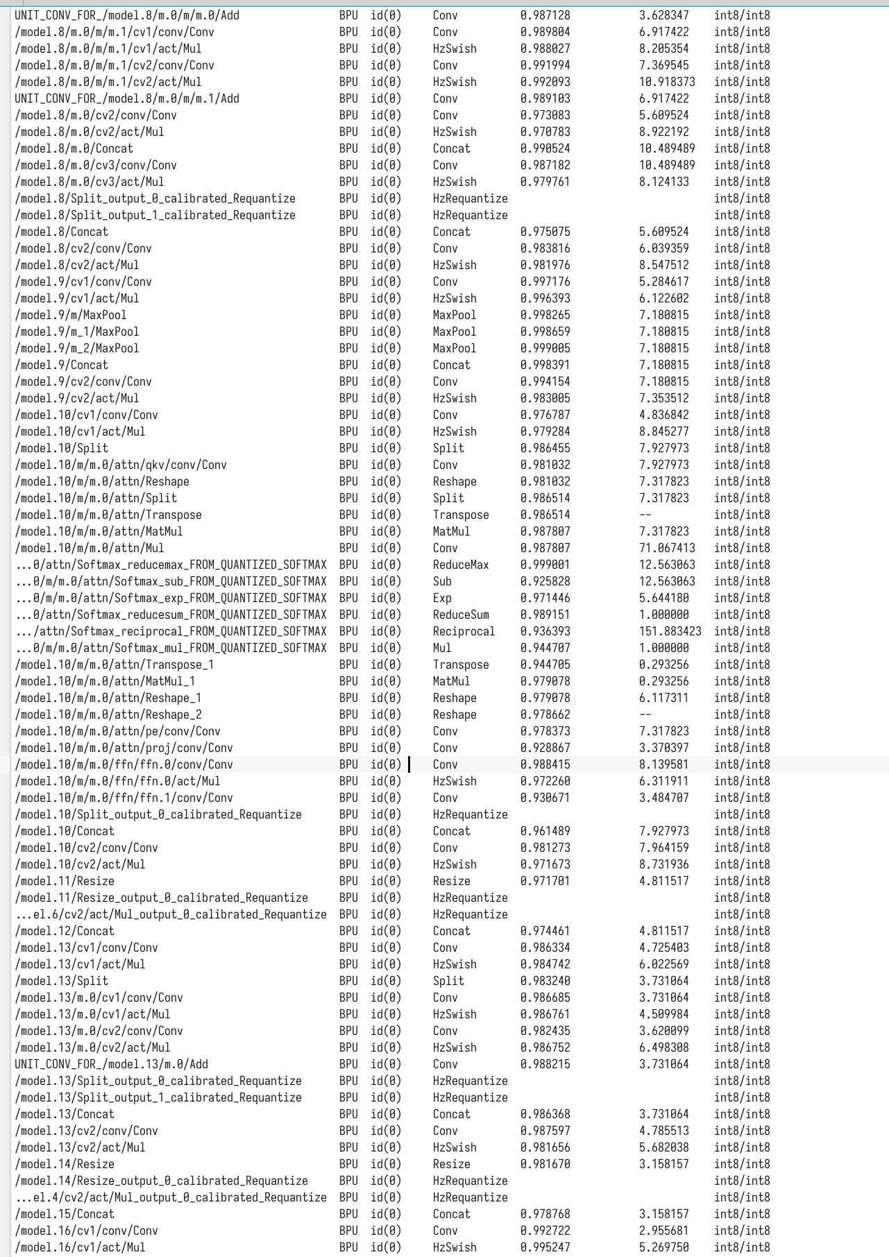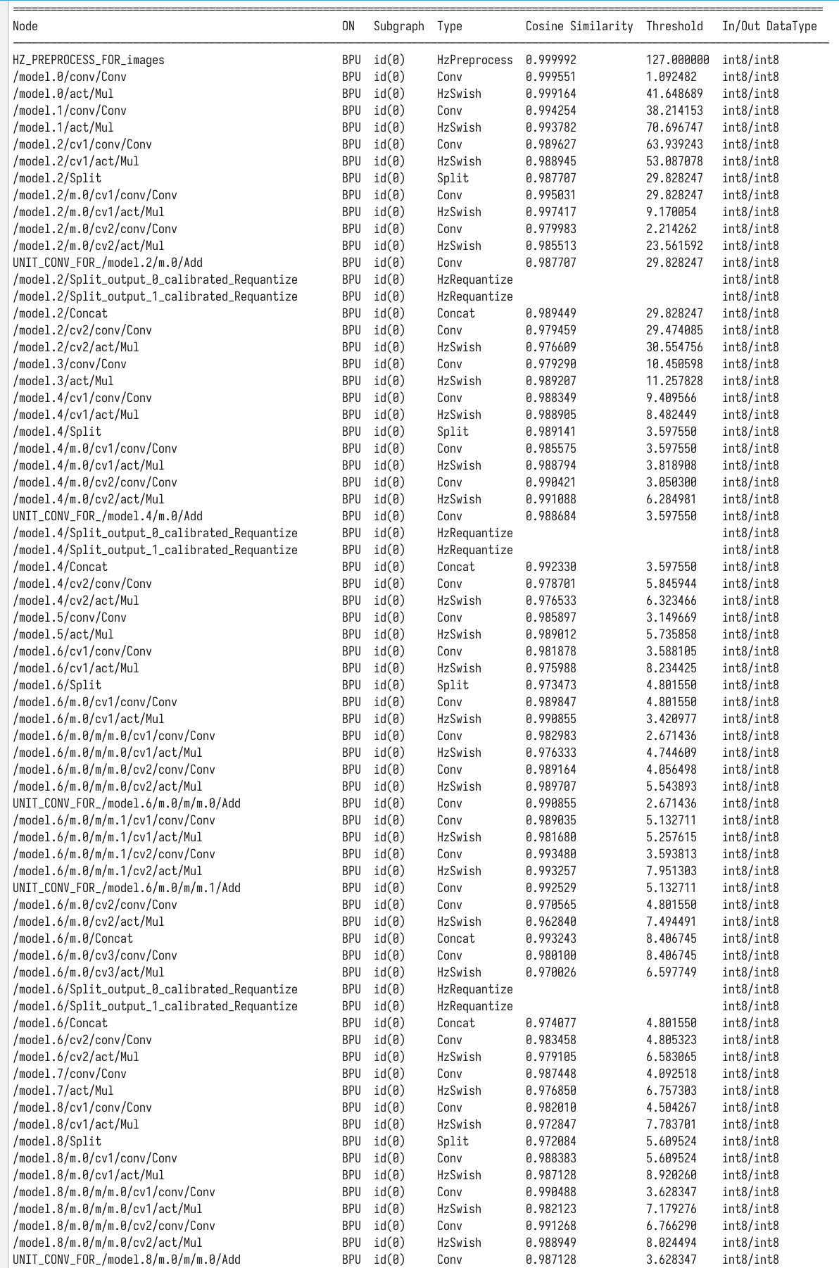 2026-01-07 17:32:55,851 INFO The quantify model output: ===================================================================================== Node Cosine Similarity L1 Distance L2 Distance Chebyshev Distance ------------------------------------------------------------------------------------- /model.23/Concat_5 0.999625 0.172588 0.001960 326.932922 2026-01-07 17:32:55,860 INFO End to Horizon NN Model Convert. 2026-01-07 17:32:56,355 WARNING node: /model.10/m/m.0/attn/Softmax does not exist, please double check your input 2026-01-07 17:32:56,355 WARNING node: /model.10/m/m.1/attn/Softmax does not exist, please double check your input 2026-01-07 17:32:56,355 WARNING node: /model.23/dfl/Softmax does not exist, please double check your input