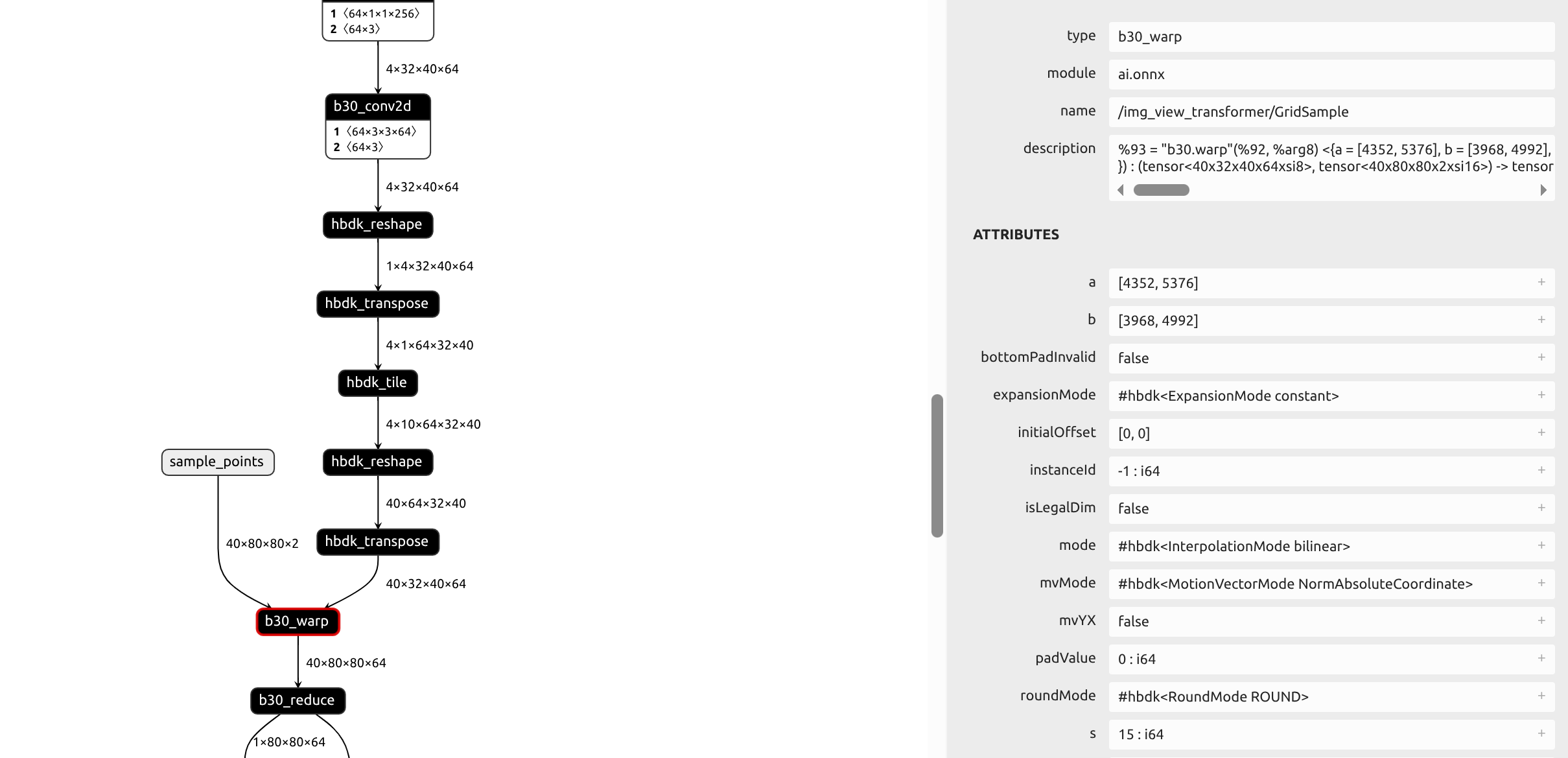 3.问题:模型转换,模型量化编译后grid sample算子没有上BPU,实现硬件是[CPU, BPU],导致在板端部署推理后出现多个线程(部署程序是一个进程单线程),CPU占用很高,推理耗时非常长,BPU占用的均值和最大值差异很大。(相同模型转J6M没有这个问题)